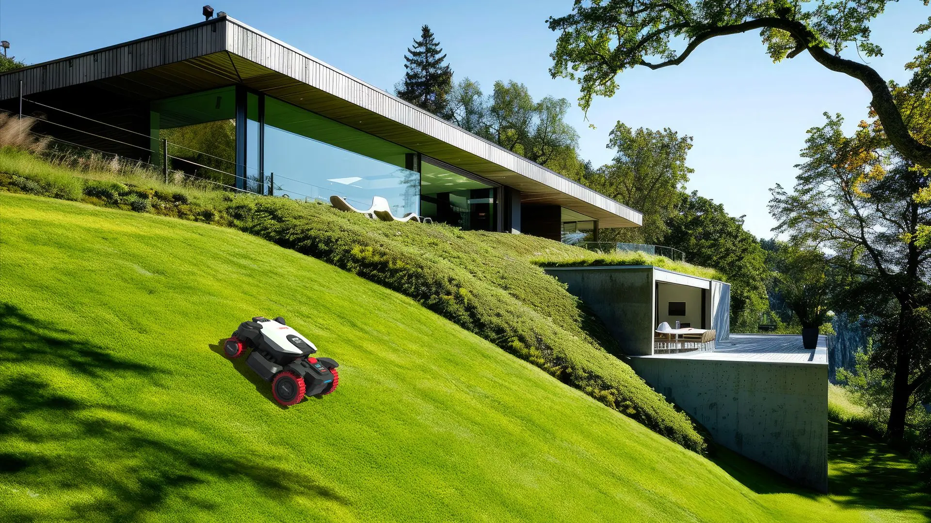 Met behulp van satellietpositionering en een RTK-correctiesignaal navigeert de maaier exact door uw tuin. Zelfs smalle doorgangen en scherpe hoeken worden moeiteloos gemaaid. - Geen