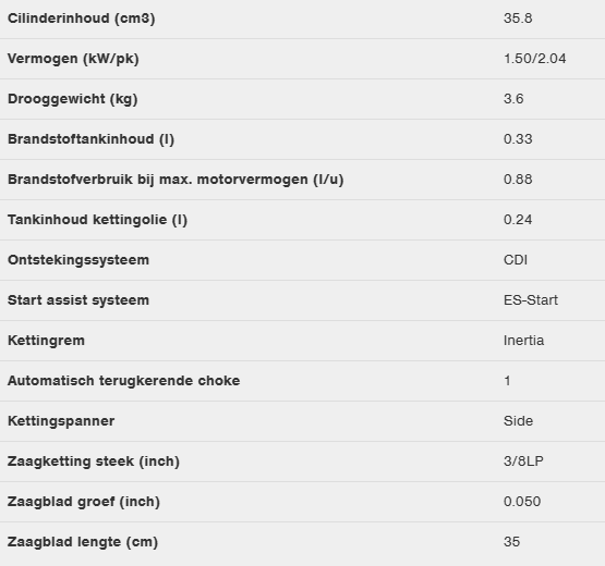 35,8 cc - 1,50 kW - ES-start - Zaagblad 35 cm - 3/8 LP - 91 PX - 0,050” - 3,6 kg