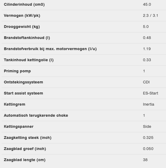45,0 cc - 2,30 kW - Zaagblad 38 cm - 0,325" - 0,050" - 5,0 kg