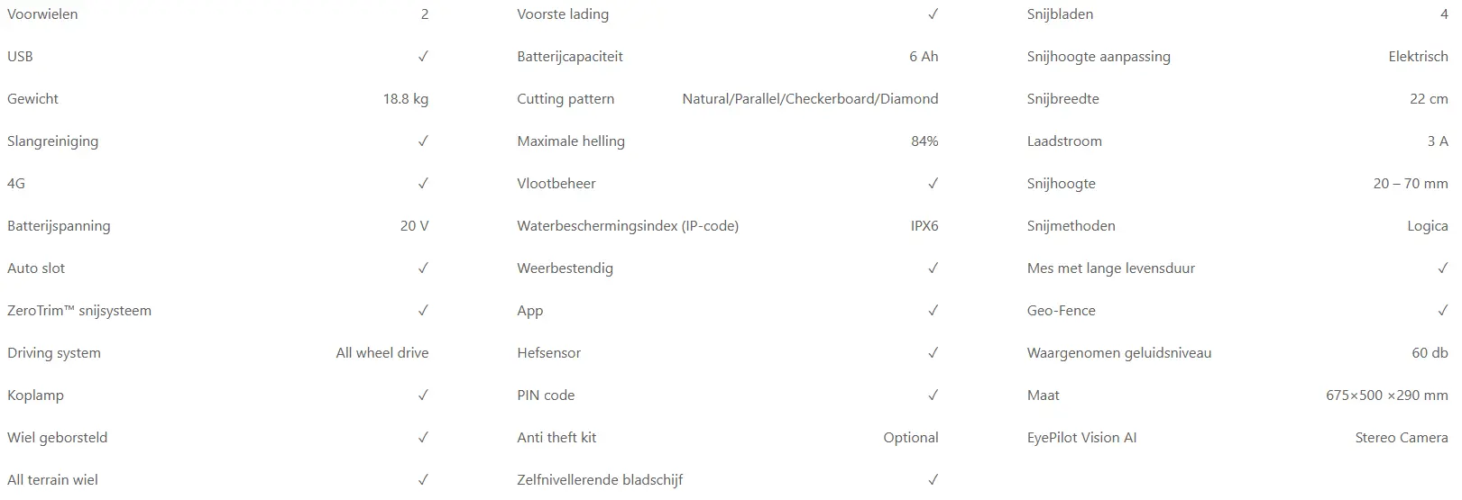 Een aandrijfsysteem met vier motoren en realtime koppelregeling behoudt tractie en richting op hellingen tot 84% (≈40°). Voorwielbesturing maakt soepele bochten mogelijk, zonder schade aan het gazon, terwijl een verticale obstakelvrijheid tot 6 cm zorgt voor betrouwbare overgangen over verhoogde randen.