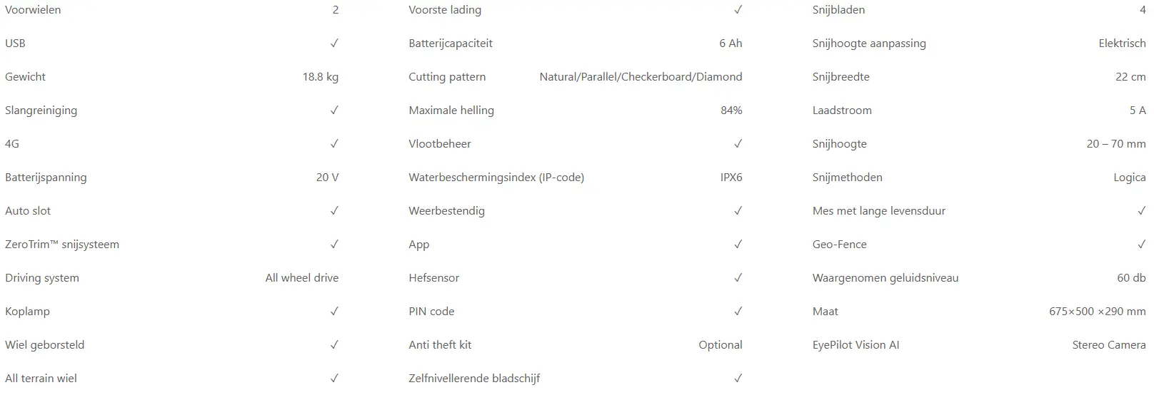 Een aandrijfsysteem met vier motoren en realtime koppelregeling behoudt tractie en richting op hellingen tot 84% (≈40°). Voorwielbesturing maakt soepele bochten mogelijk, zonder schade aan het gazon, terwijl een verticale obstakelvrijheid tot 6 cm zorgt voor betrouwbare overgangen over verhoogde randen.